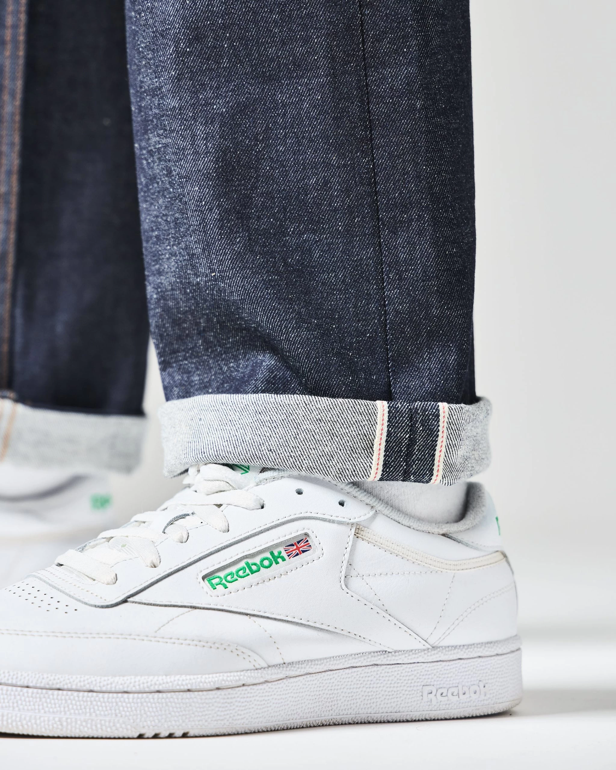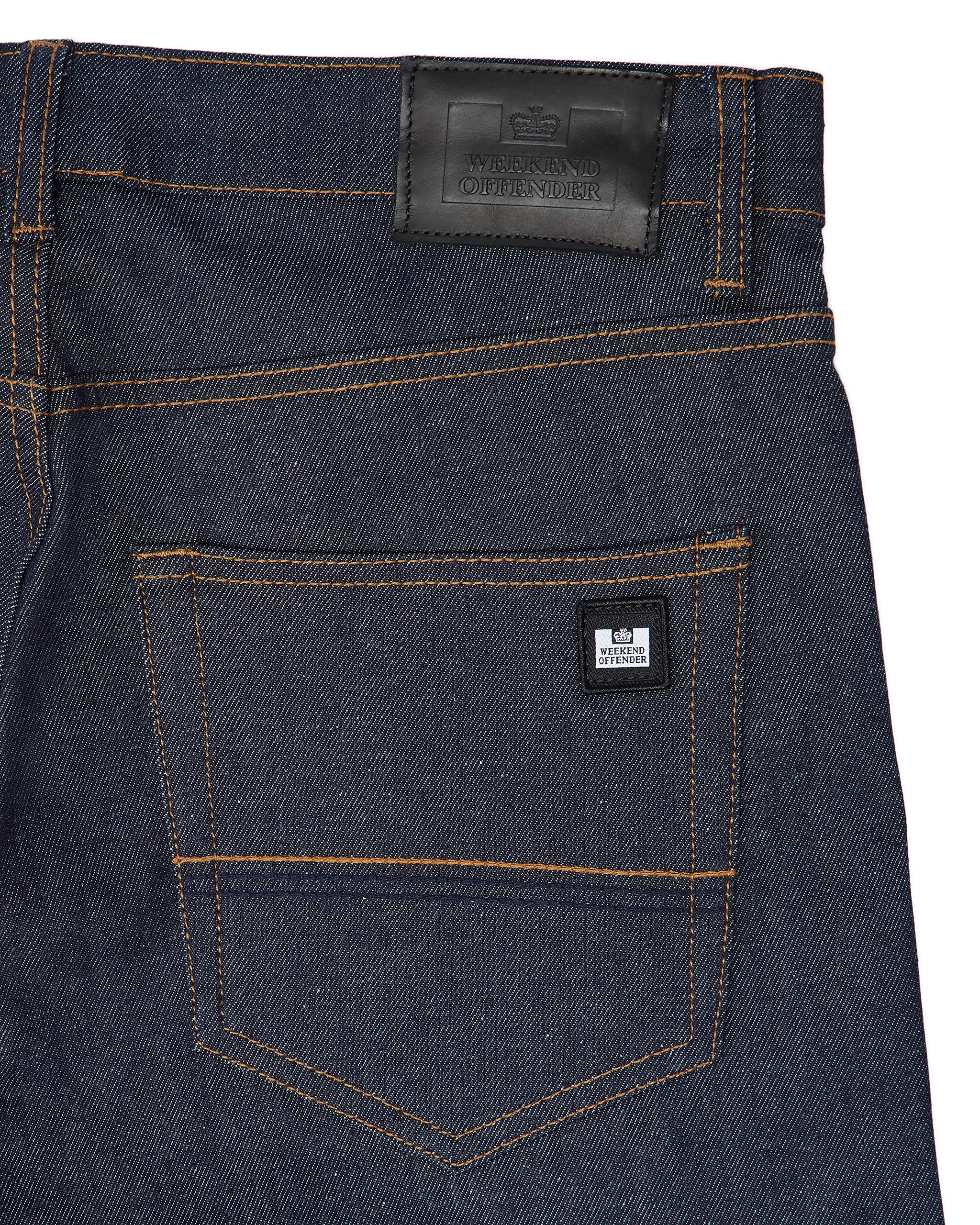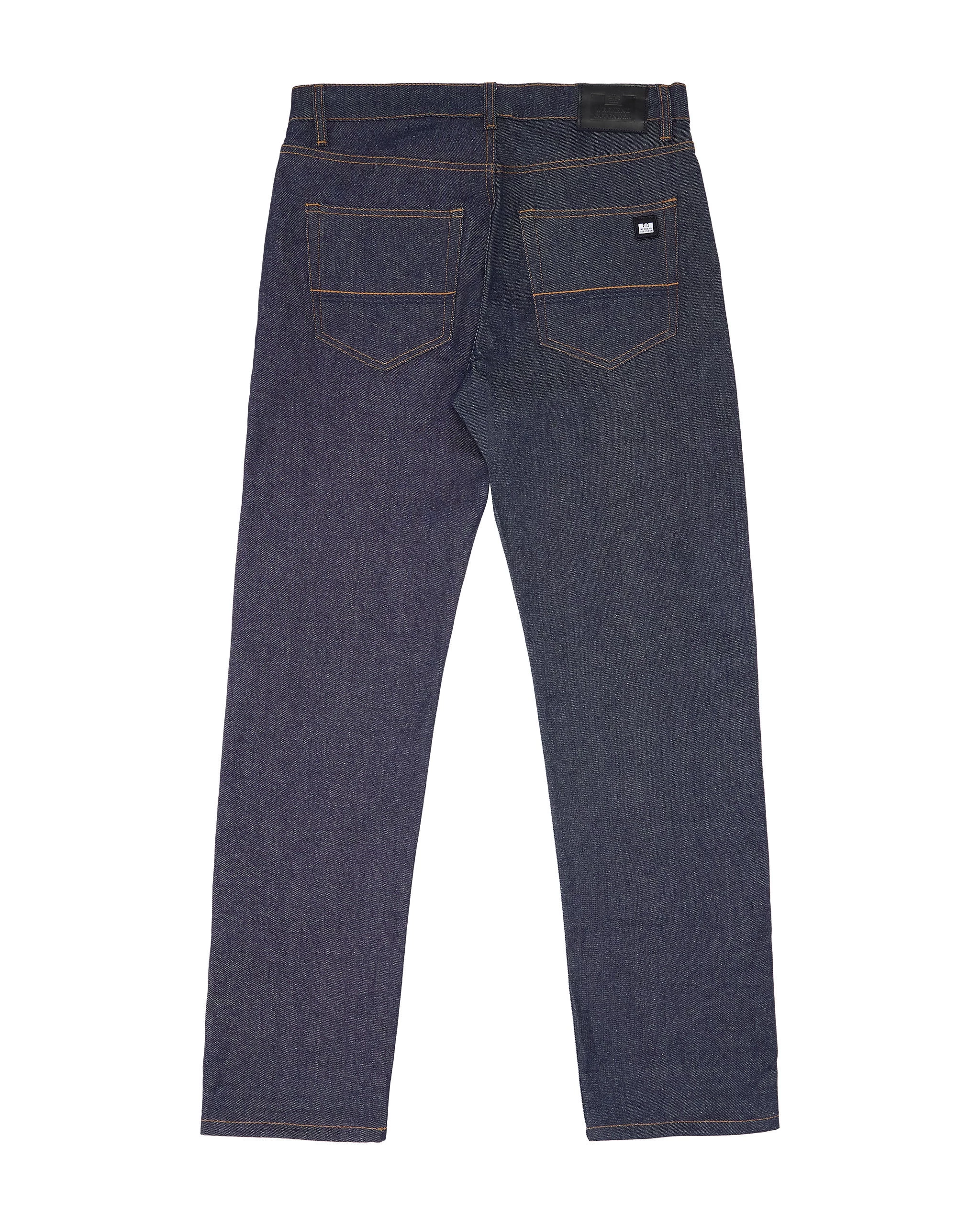 Selvedge denim is woven on traditional, narrow shuttle-looms with one continuous weft thread passed back and forth across the loom in a wooden shuttle. Easily identified by its characteristic red and white selvedge edge, showing on the outside leg seam.