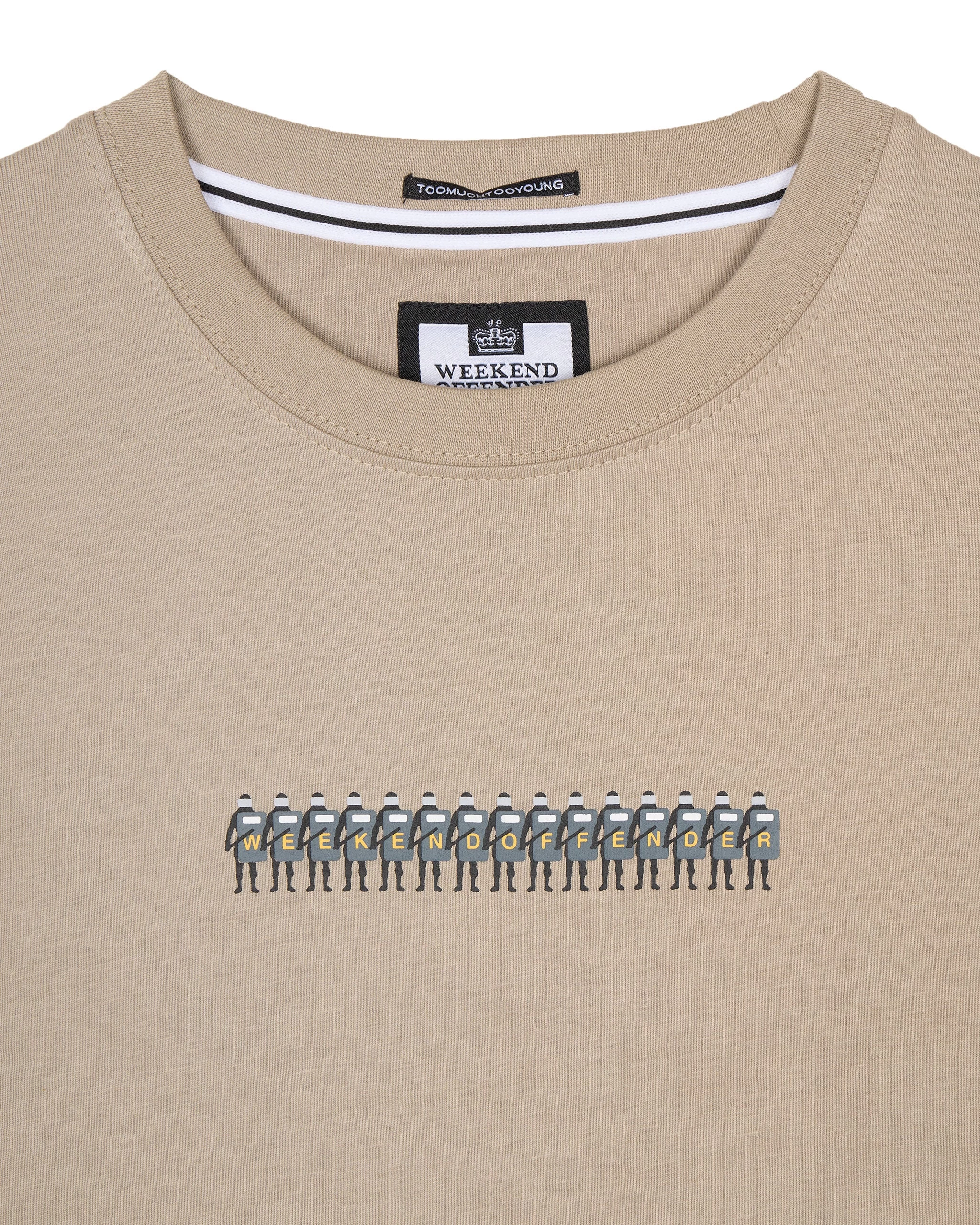 A line of Riot Police with shields spelling out Weekend Offender.
