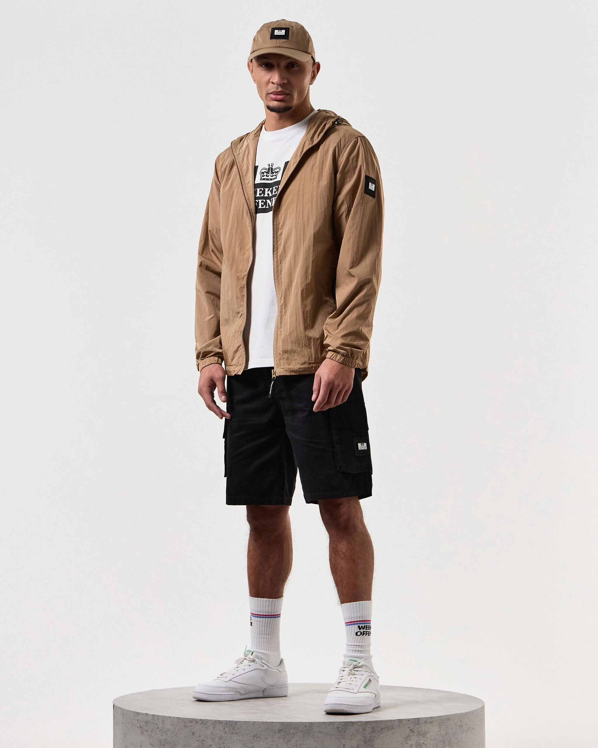 A staple WO jacket made from lightweight high density woven 100% Nylon parachute style fabric with a lightly reflective surface. Treated with an additional DWR (Durable Water Repellent) coating.