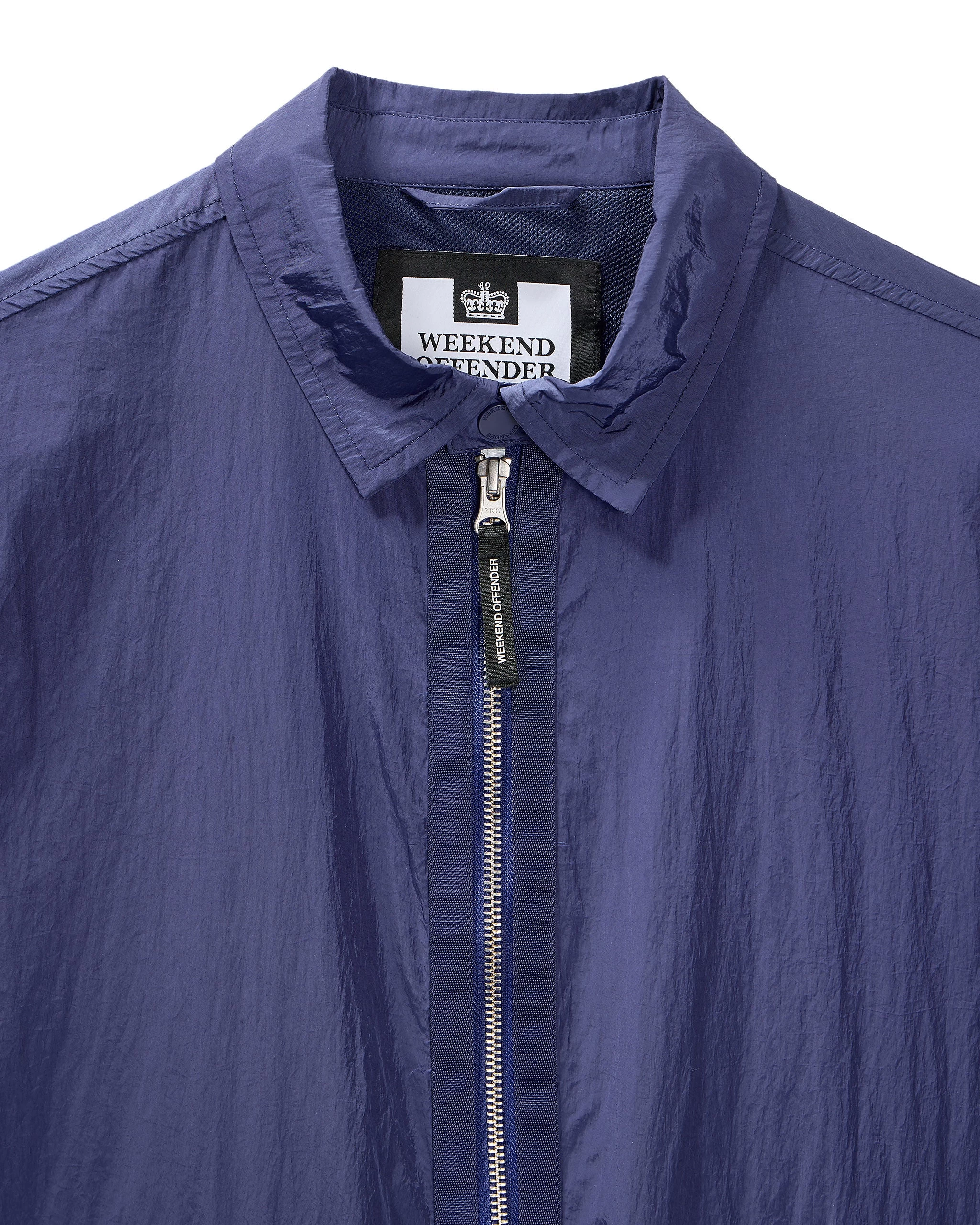 WO staple over-shirt made from a lightweight high density woven 100% Nylon parachute style fabric with a lightly reflective surface. Treated with an additional DWR (Durable Water Repellent) coating.